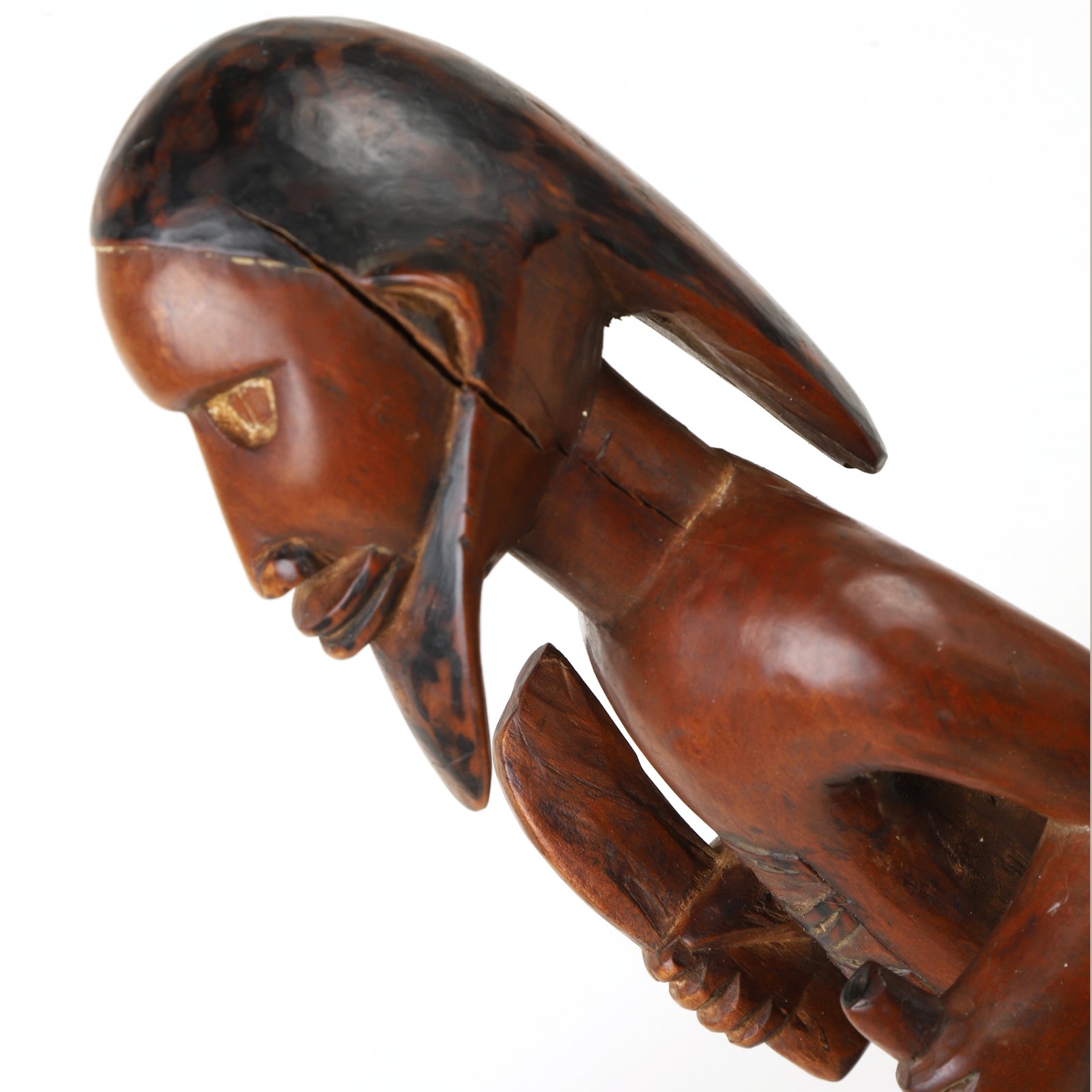 Le torse est marqué par des scarifications. Le bras droit tient un bâton, la main gauche, un fusil.