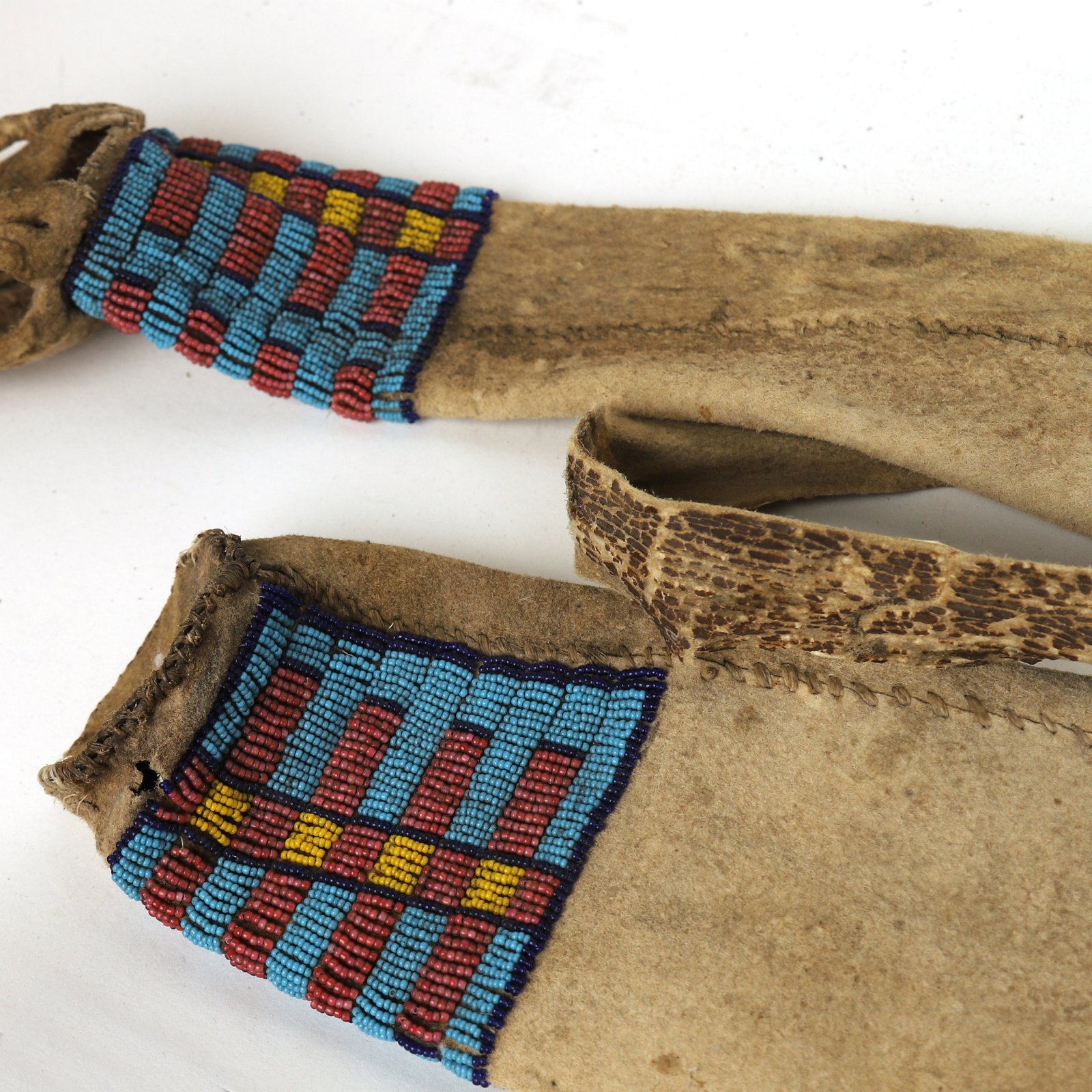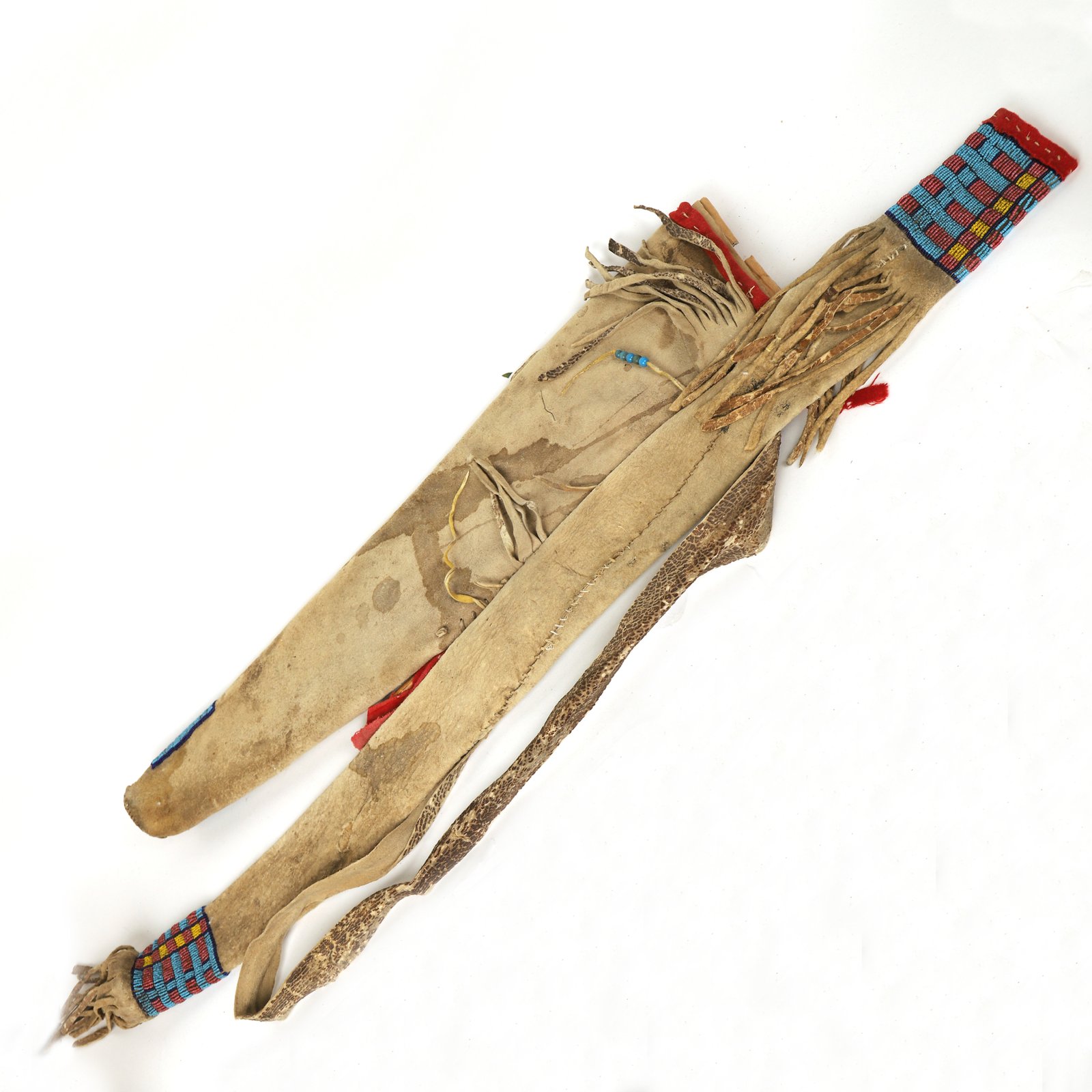 Carquois sioux en peau de bison, brodée en lazy stitch, de perles bleu turquoise, rose et jaune, formant une sorte de damier.