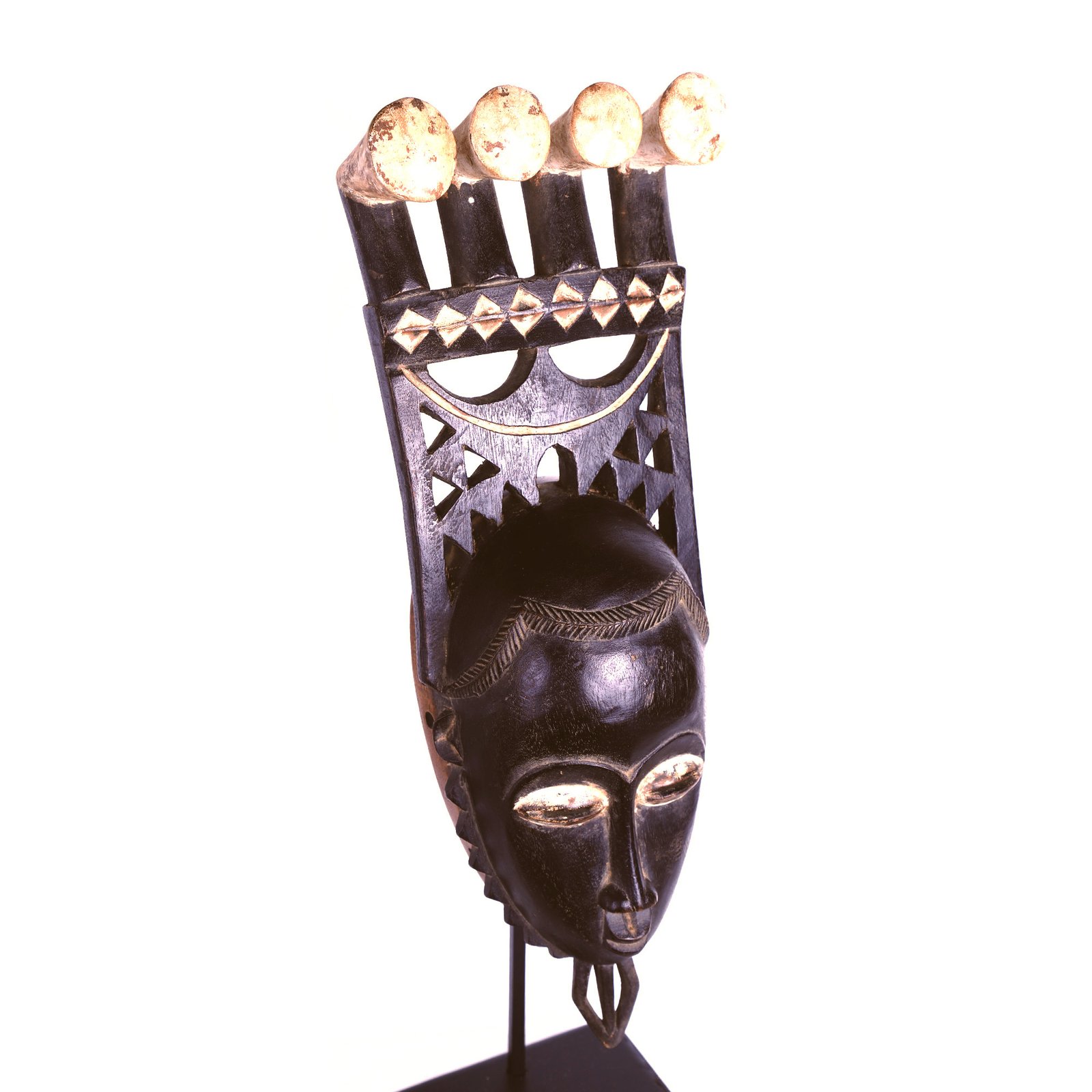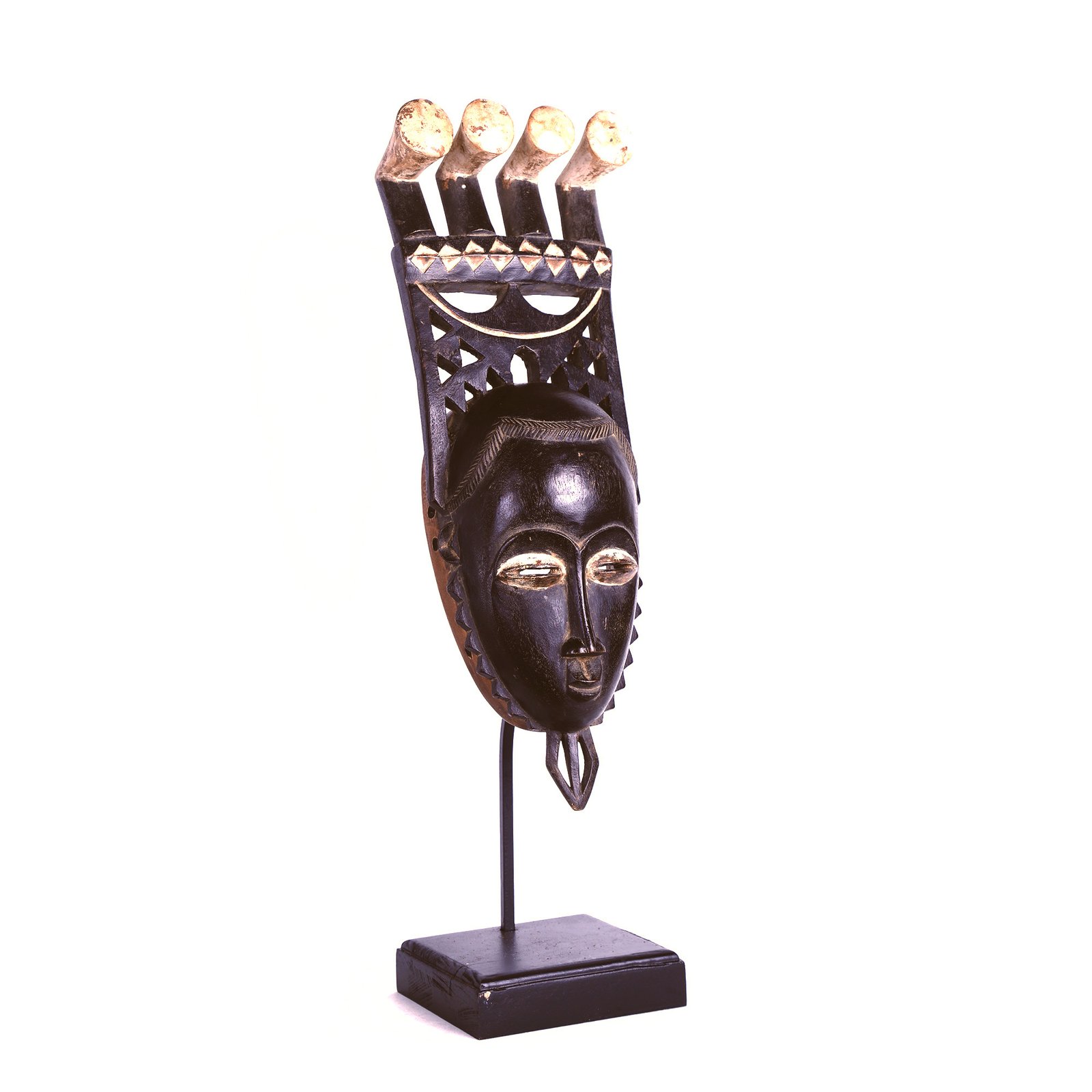 Masque portrait Baoulé, Côte d’Ivoire. Masque en bois à patine noire, surmonté d’une coiffure à quatre extrémités. Ce masque appartient à la tradition baoulé dite des masques portraits, utilisés lors des danses des célébrations mblo. Le visage féminin représenté est idéalisé afin d’exprimer une beauté intérieure et morale.