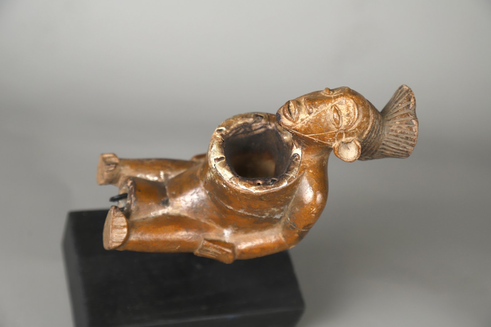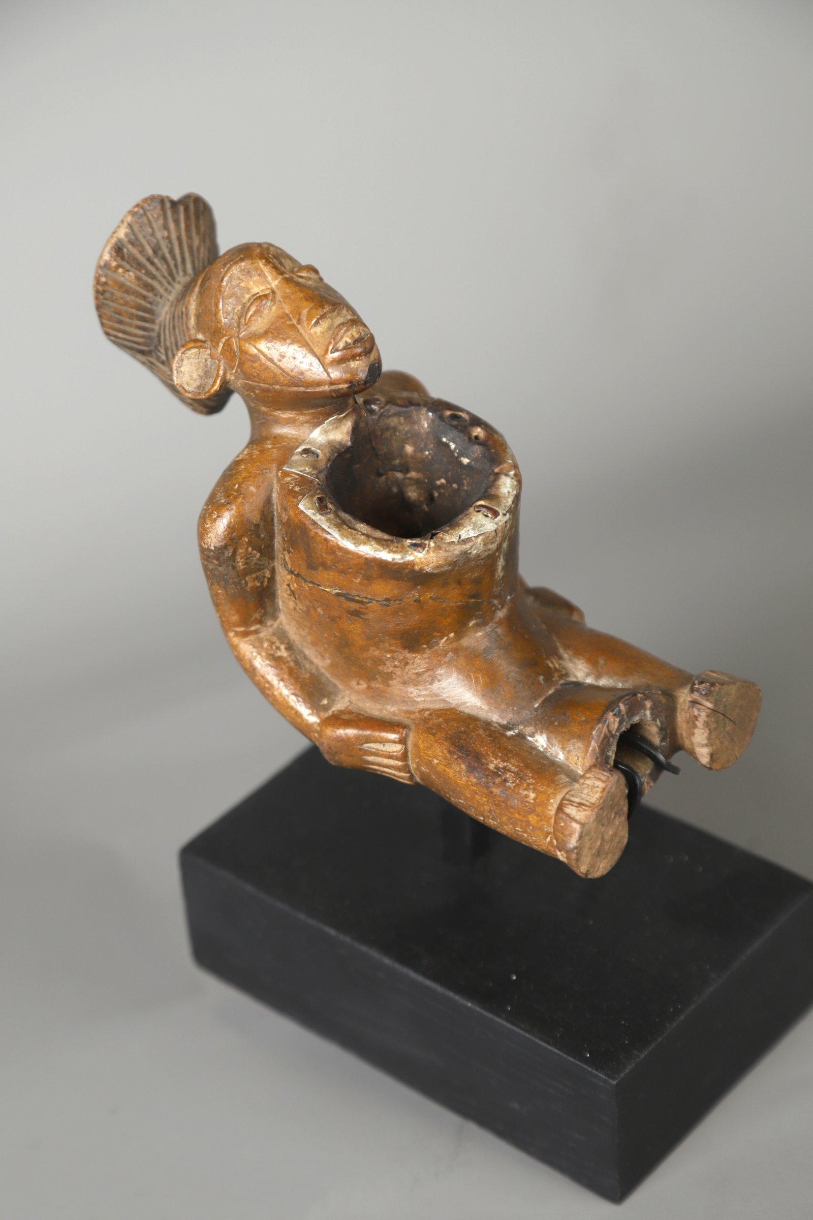 Ce fourneau de pipe est d’une grande maîtrise des sculpteurs. Le corps représenté épouse la forme du fourneau. Le visage scarifié de motifs prolonge une coiffure typique des Mangbetu, met en évidence les traits essentiels de leur statuaire. Ces fourneaux de pipes anthropomorphes Mangbetu sont très rares, les pipes figuratives étaient sans doute réservées à l’élite. Le col du foyer est recouvert de métal et il se trouve des résidus de tabac.